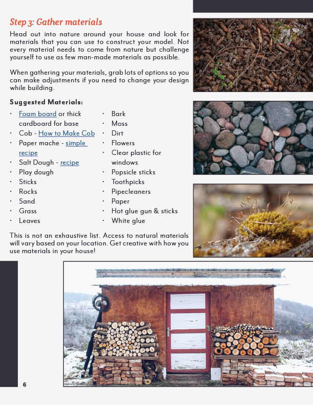 You'll get a PDF guide that leads your student through the process of designing and building a model dwelling. Students will practice planning, hands on building, and photography/videography.